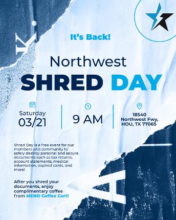 Energy Capital Credit Union (ECCU) invites you to attend our Northwest Shred Day on Saturday, March 21 at 9 AM ?? at 18540 Northwest Fwy, Houston, TX 77065 ??
